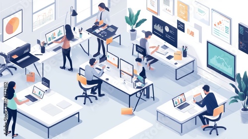 High-tech graphic design studio with designers working on business branding projects, creativity meets technology., clean lines, simple shapes,
