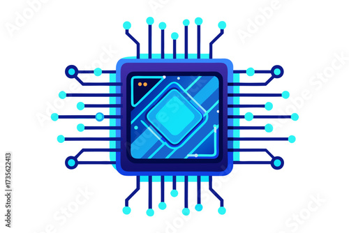 High-tech illustration of an artificial intelligence (AI) microchip with glowing blue digital circuit lines, symbolizing advanced technology, machine learning, data processing, and futuristic computin