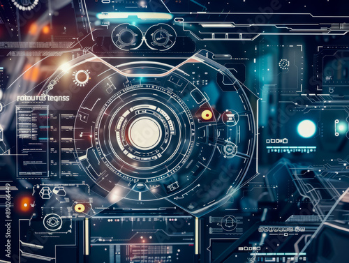High-tech interface with circular display, digital gauges, info panels. Generative AI