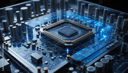 High-Tech Microprocessor on a Circuit Board with Illuminated Elements