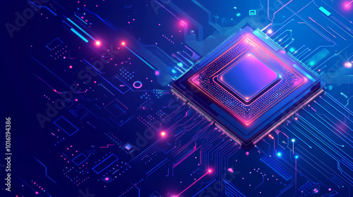 High-tech processor microchip incorporating AI technology. Quantum chip designed for big data processing. Isometric view of a CPU mounted on components on a motherboard. Includes both microchip and mi