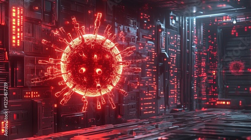 High-tech security system attacked by a digital virus, red alerts, intense atmosphere