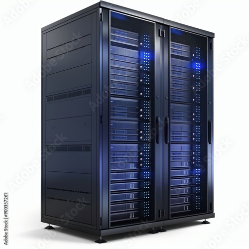 High-tech server rack with blue lights, white background, for data centers, realistic rendering, high resolution.