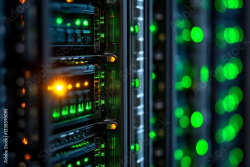 High-tech server room featuring illuminated servers and glowing indicators during nighttime operations