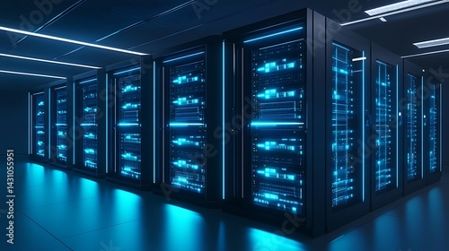 High-tech server room with glowing blue racks futuristic data storage security