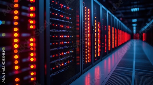 High-tech server room with illuminated racks, showcasing data processing in a modern facility