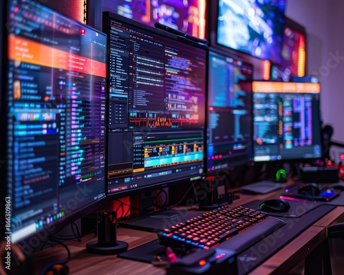 Hightech workstation with multiple monitors displaying advanced software development tools, code editors, and realtime debugging applications
