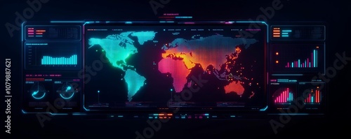 High-tech world map display with vibrant colors and data graphs for analysis.
