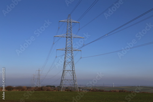 High-voltage electricity pylons overlooking farmland on a hilltop in Devon.