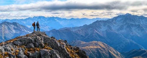 Hikers Admiring Mountain Range with Scenic Cloud View in a Serene Natural Landscape