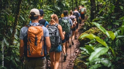 Hikers on jungle trail, lush forest backdrop