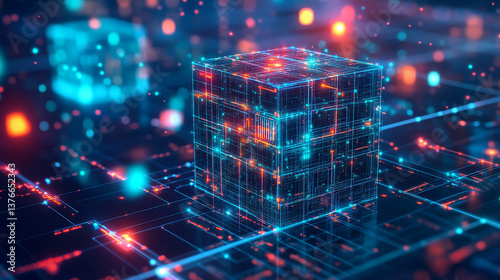 Hi-tech Square blocks are collected in a cubic array against the background of information fields. 3d illustration of blockchain abstract concept. Artificial intelligence learnability