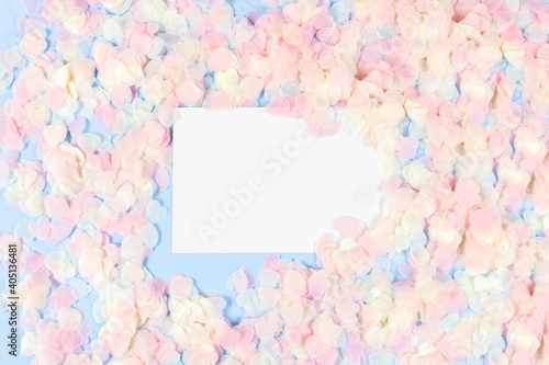 Holiday romantic gentle background with pink confetti in shape of hearts and white mockup blank for the design. Flat lay, copy space. Greeting card. Valentine's Day, wedding, love concept.