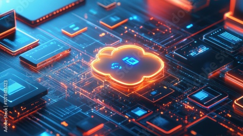 Holographic cloud icon surrounded by devices, illustrating seamless data sync between gadgets