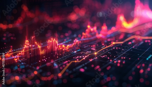 Holographic financial chart, dynamic data visualization, dark theme, neon accents