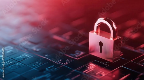 Holographic lock floating above binary code matrix, representing advanced cybersecurity, cybersecurity, data encryption