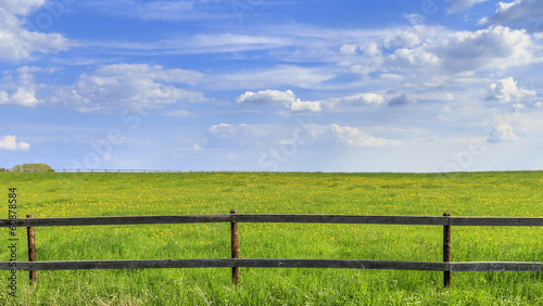 Holzzaun vor grüner Wiese