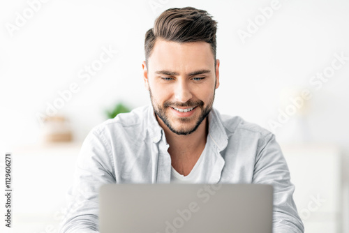 Home office concept. Closeup portrait of happy guy working on pc laptop, sitting at workplace at home interior. Excited male student using computer, study and education