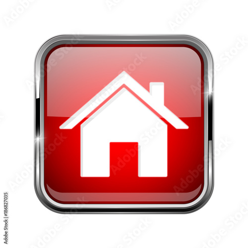 Home page icon. Square red 3d icon with chrome frame