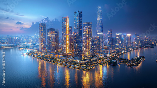 Hong Kong's vibrant night cityscape reflects in the harbor, a stunning panorama of urban skyscrapers and illuminated architecture