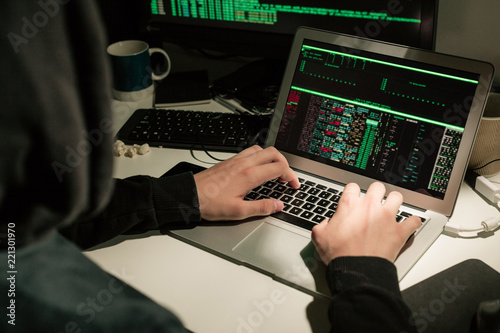 Hooded computer hacker using laptop
