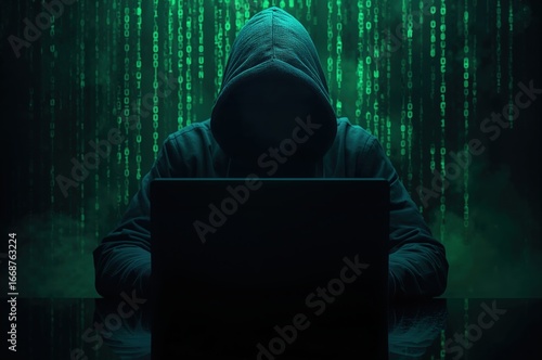 Hooded figure using a laptop in a dark environment with green binary code background, symbolizing cybersecurity and hacking.