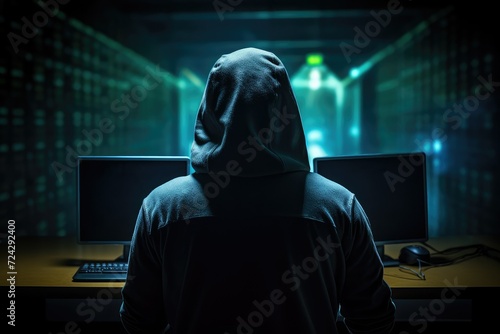 Hooded hacker in a dark room with computers and binary code. Abstract image of a hacker. Back view of hacker in the process of hacking the network. hacking and cyber crime concept.