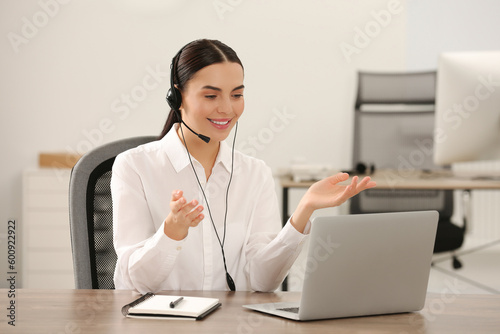 Hotline operator with headset working on laptop in office