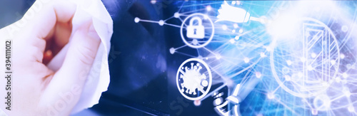 House cleaning concept. Wipe dust off surfaces. Disinfectant treatment of door handles TV electrical. Sanitary treatment at home in quarantine.
