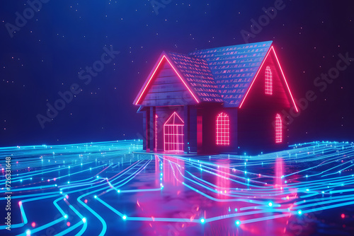 House with futuristic network connection technology big data. Blue neon background.