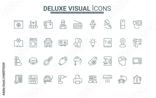 Household, laundry and kitchen equipment, virtual reality glasses thin black outline symbols vector illustration. Electrical appliances and devices for home and repair work line icons set.