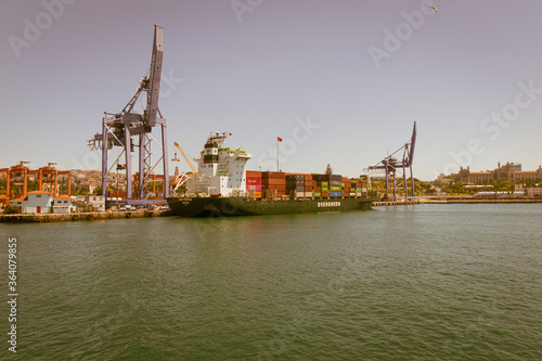 Huge cranes load a ship on the sea freight loading platform - editorial content.