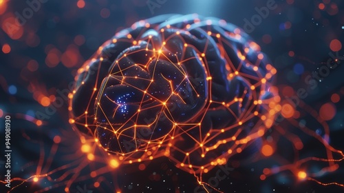 Human brain connected with glowing nodes showing active nerve cells illustrating neural network