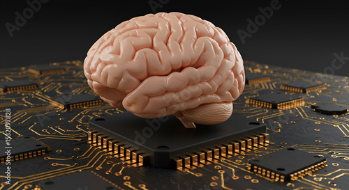 Human brain positioned atop a computer chip on a circuit board. 3D render of human brain resting on a computer chip set against a circuit board background.