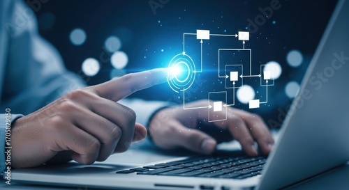 Human finger touching a digital flow chart on laptop screen