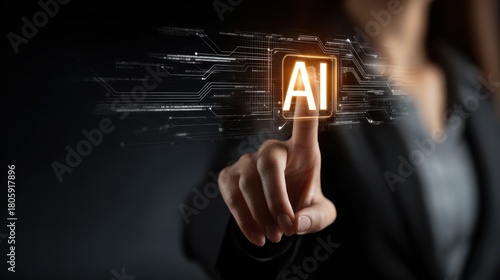 Human finger touching glowing AI button on futuristic digital interface with abstract circuitry