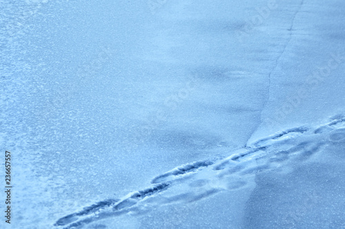 Human footprints on the surface of a frozen pond. Winter lake. Dangerous thin cracked ice