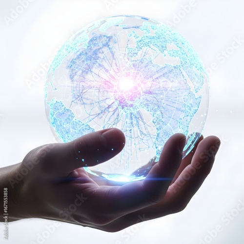 Human hand holding AI globe with interconnected glowing pathways, white backdrop.