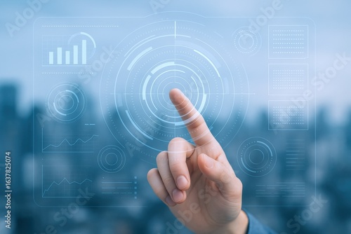 Human Hand Touching Digital Interface over Cityscape, Representing Innovation and Technology