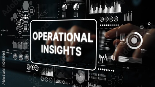 Human Hands Typing on a Keyboard with Digital Interface Displaying Operational Insights and Analytical Data Visualizations. Asymptotic smart data analytic.