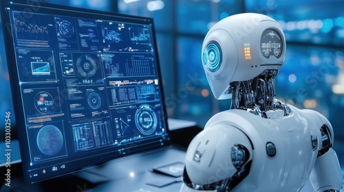 Humanoid Robot Analyzing Data on a Computer Screen