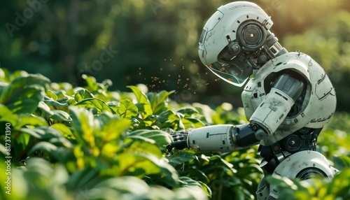 Humanoid robot harvesting crops on a farm using advanced agricultural programming.