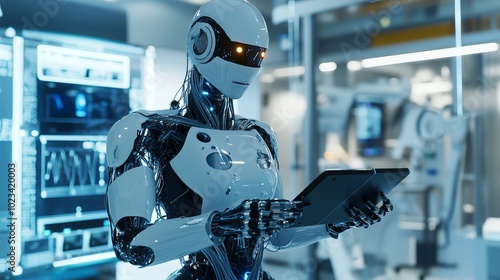 Humanoid Robot Holding Tablet in Futuristic Lab, Advanced AI and Robotics, Cutting-Edge Technology, Artificial Intelligence, Generated AI