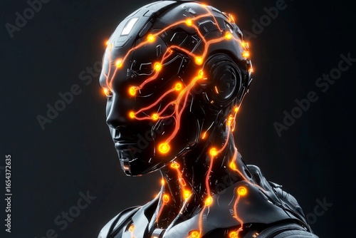 Humanoid robot showcases glowing circuits in a futuristic environment