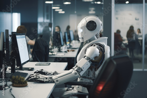 Humanoid robot using his laptop computer. Artificial intelligence helping to write a code. Robot programming in office environment.