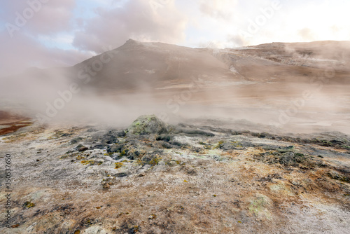 Hverarond geothermal area in Myvatn, Iceland. Steam vents and hot pools, muddy hot soil, sulfur smoke and colorful textures and patterns during blue hour.