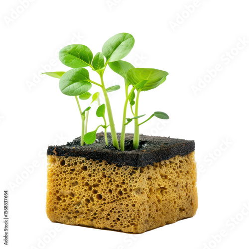 hydroponic pot with vegetable seedling growing on sponge front view isolate on transparency background
