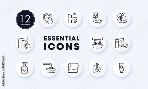 Hygiene set icon. Faucet, hand washing, drying, towel, shower, antiseptic, liquid soap, etc. Sanitation concept. Neomorphism style. Vector line icon for Business and Advertising