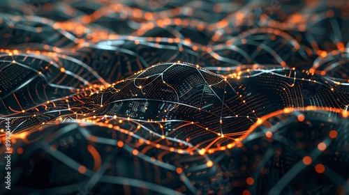 Hyper-detailed image of a blockchain visualization, interconnected nodes, data flow