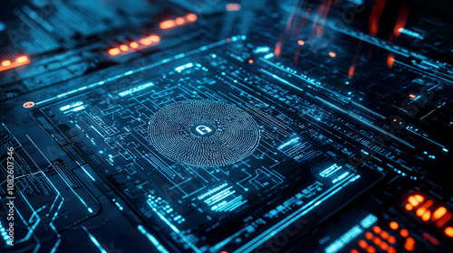Hyper-realistic biometric authentication system with glowing encryption layers, protecting sensitive networks
